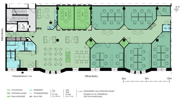 2. kerroksen siisti ja tilava toimisto, josta näkymät Vilhonkadulle. Kuvassa esitetty nykytilanteen pohjaratkaisu, jossa 31 työpistettä ja neuvottelutilaa 16 henkilölle. Tilat ovat muunneltavissa ja tilaratkaisut toteutetaan toiveiden mukaan.